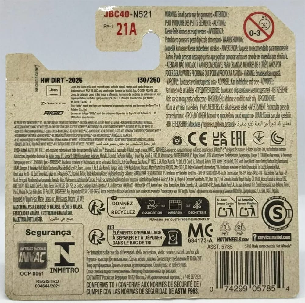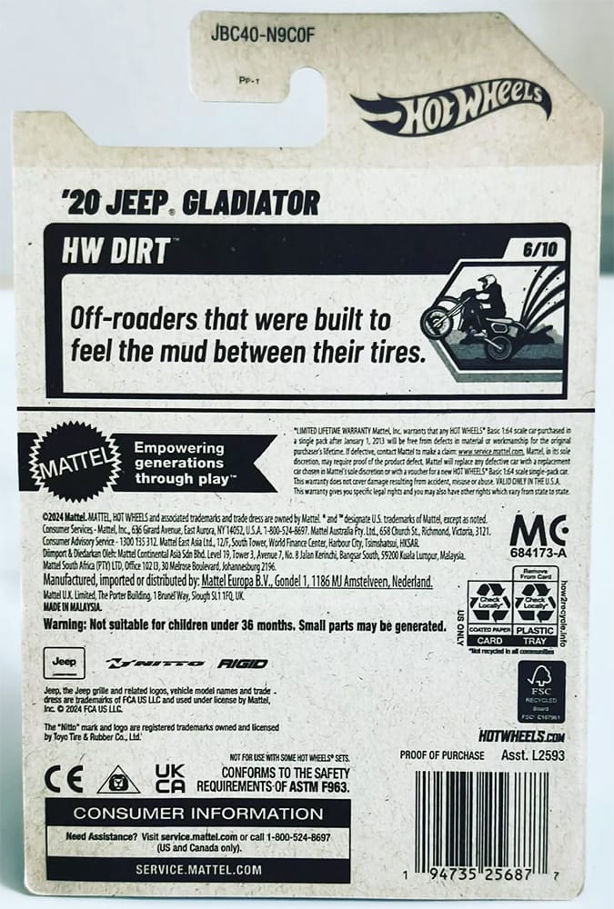 The '20 Jeep Gladiator, a 2025 Super Treasure Hunt packaged on its U.S., international, and short cards.
