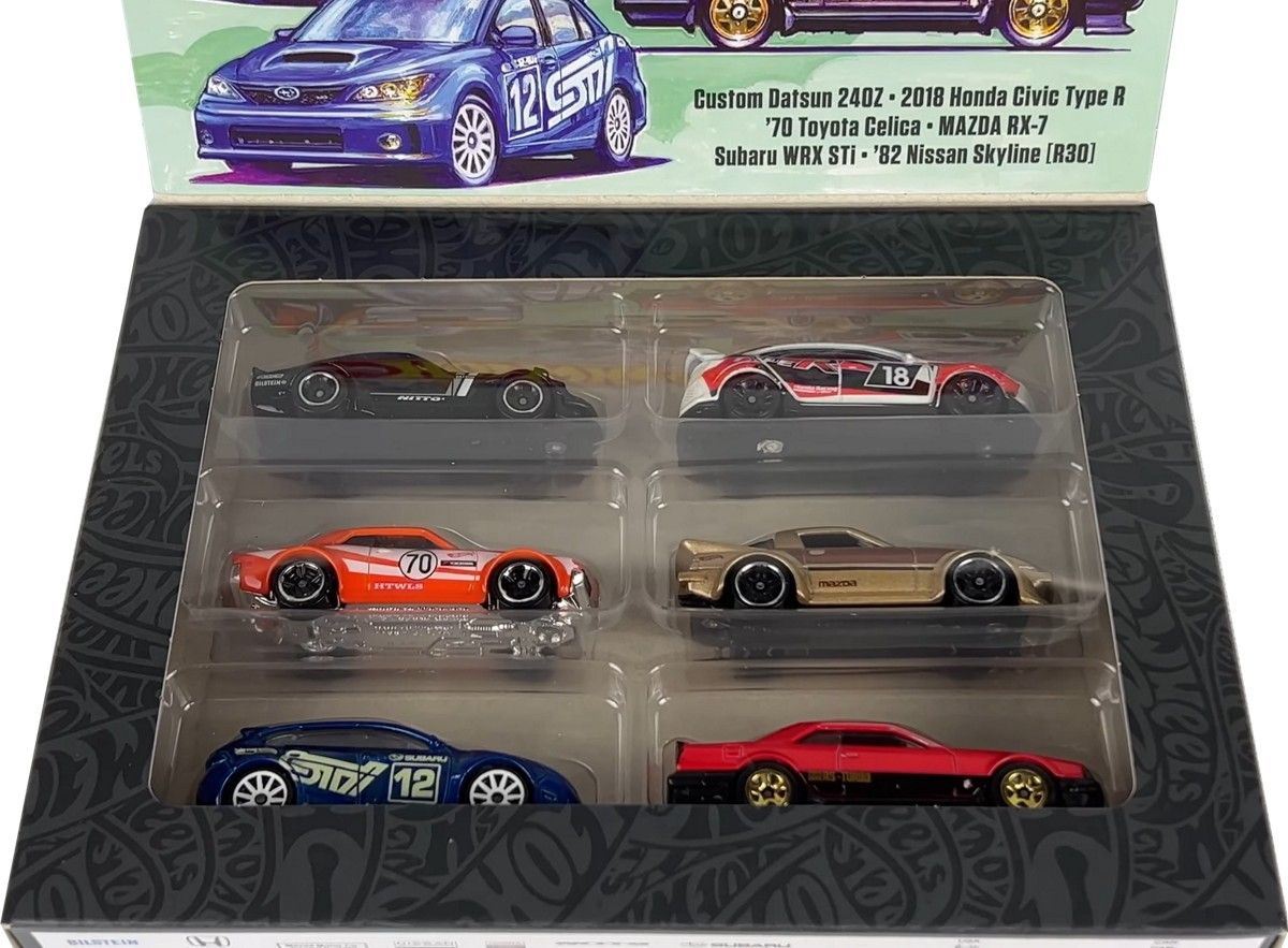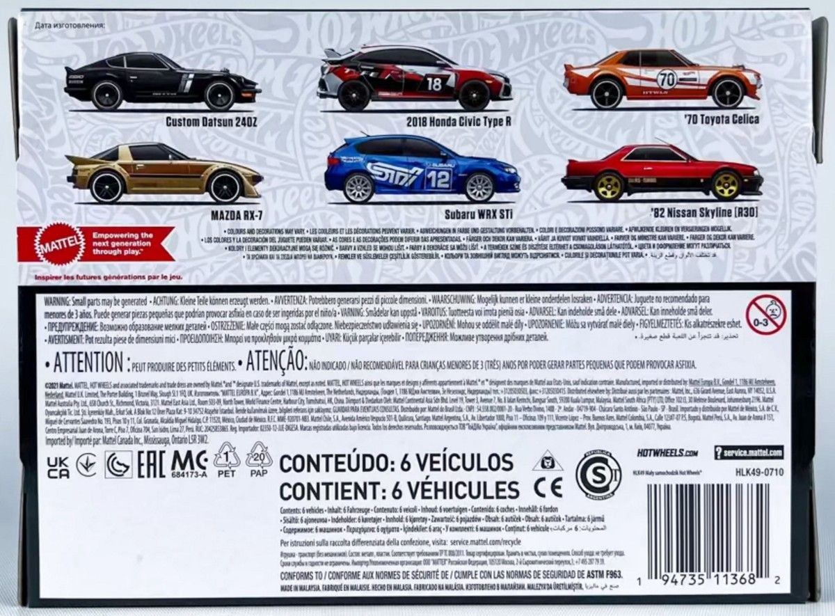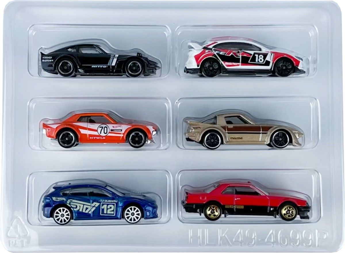 Here are more pictures of the upcoming Hot Wheels Japanese box set. The 6-car basic set features a variety of vehicles from Japanese manufacturers. Half the cars are from the 70s and 80s and the rest are from the 2010s.