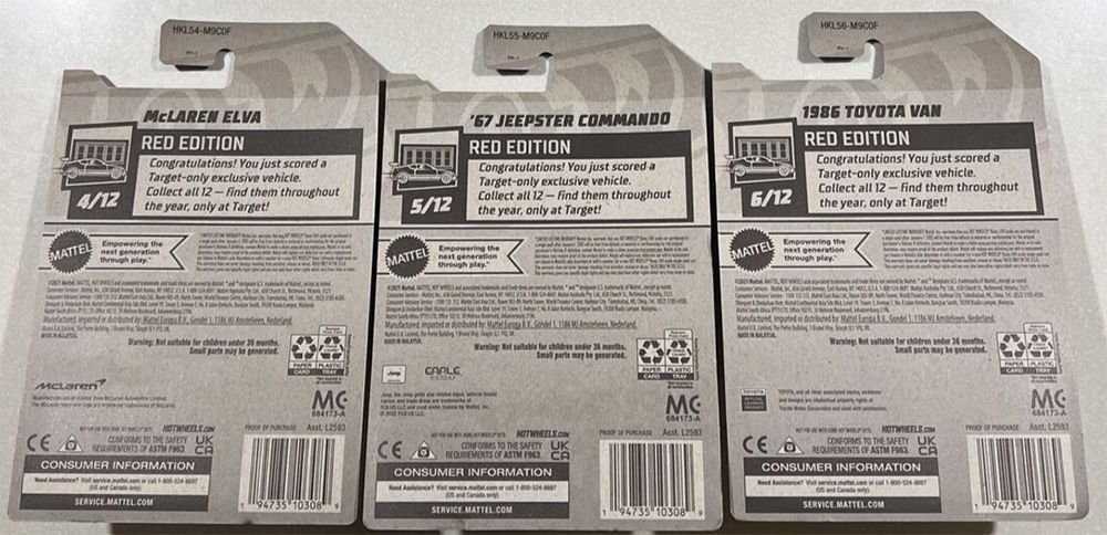 Red Edition uses recolored vehicles from other series that share the same graphics and mainline collector number. A total of twelve cars will be released for this Target exclusive set.