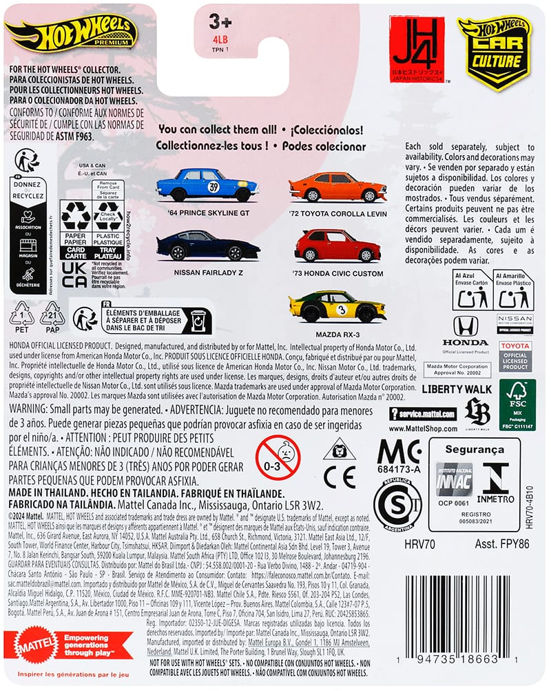 Car Culture is a premium series with added detail and Real Rider wheels. Japan Historics 4 is mix "B" in assortment FPY86 and ships in 10-count cases. Two of each vehicle should be in a case unless one has been replaced with the chase car.