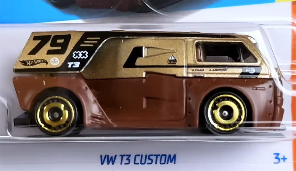The Hot Wheels casting is a heavily customized version of the Volkswagen Type 2 T3. Produced from 1979 to 2002, the third generation of the Volkswagen van is known as the Vanagon in North America and the Transporter or Caravelle elsewhere.