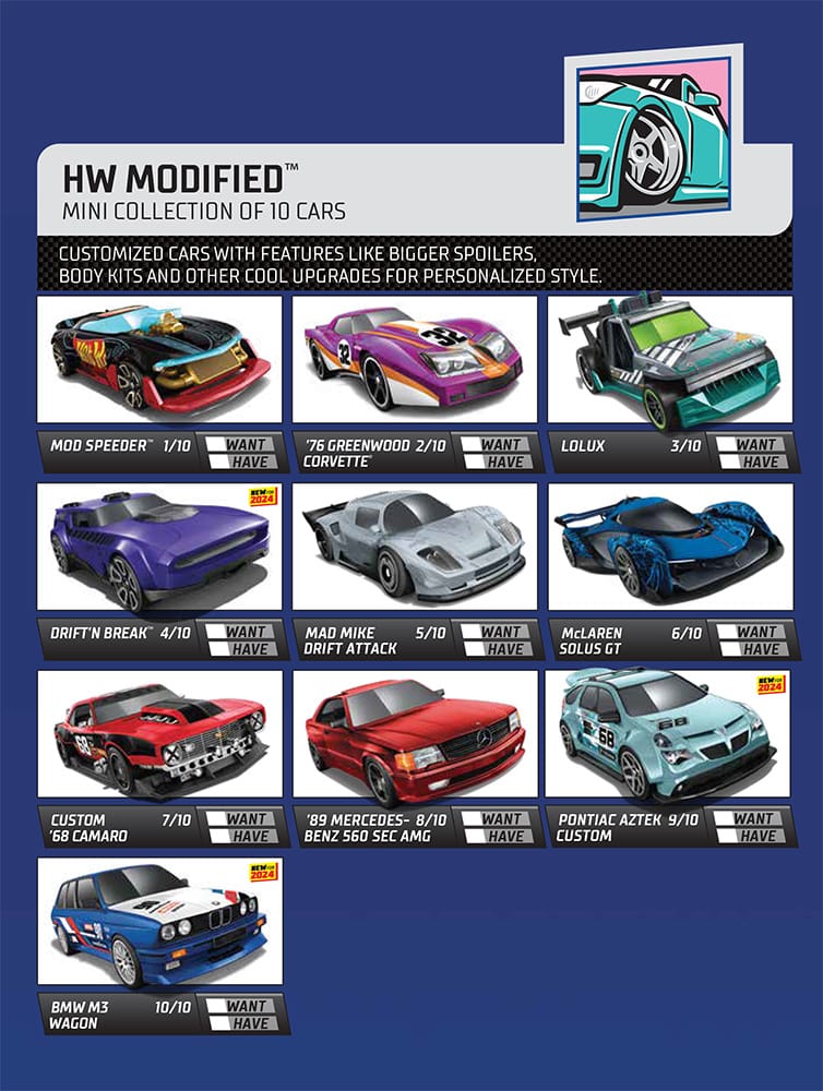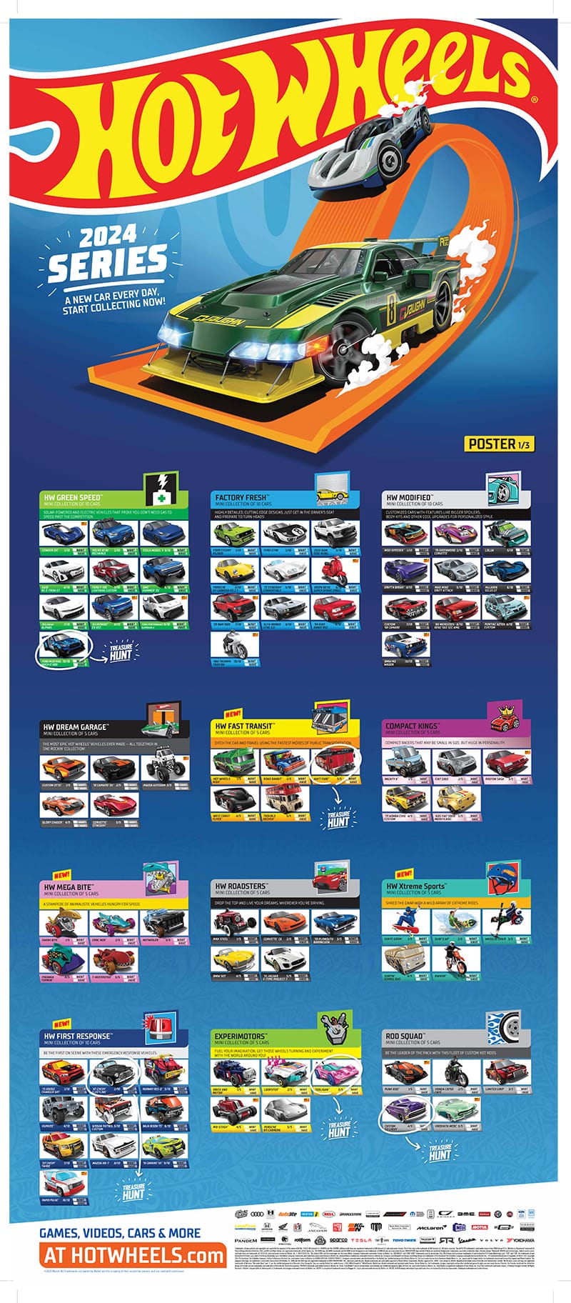 Hot Wheels posters are back for 2024. The first poster features mainline cars organized into twelve different series.