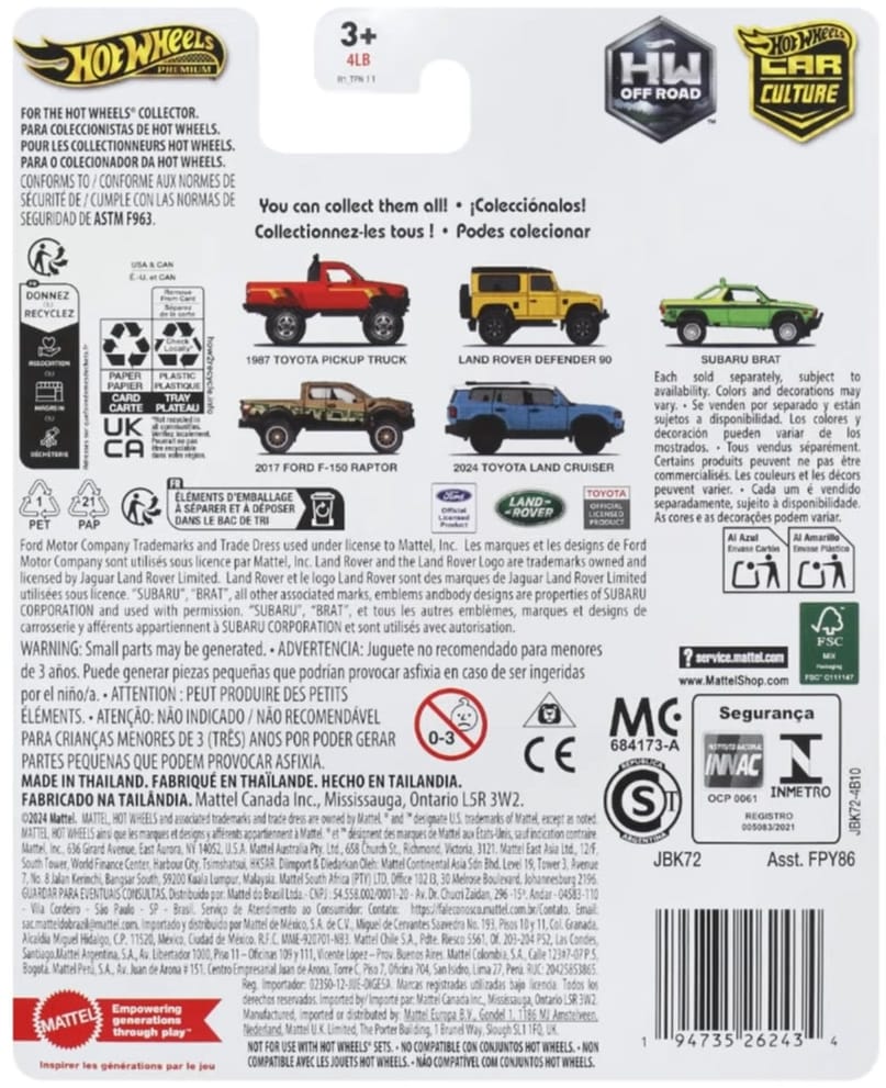 Car Culture vehicles are metal/metal with premium details and Real Rider wheels. HW Off-Road is in mix "H" of assortment FPY86 and ships in 10-count cases. Two of each vehicle should be in a case unless one has been replaced with the chase car.