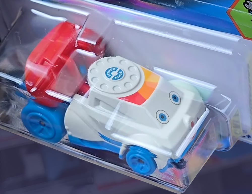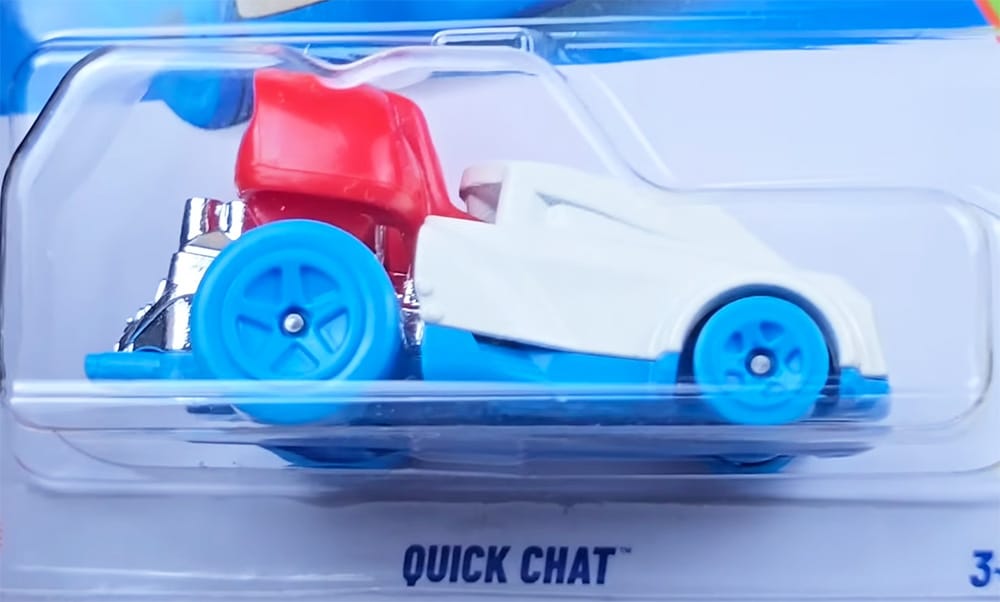 Quick Chat is a Hot Wheels take on the Fisher-Price Chatter Telephone, featuring a rear-mounted V8 engine. When you roll it, the phone bobs up and down like the original toy.