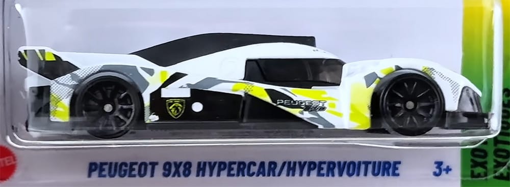 The Peugeot 9X8 is a hybrid Le Mans Hypercar unveiled in 2021 and competing in the FIA World Endurance Championship since 2022. A mid-mounted twin-turbo 2.6-liter V6 engine with 670 horsepower powers the rear wheels, while a 270-horsepower electric motor drives the front.