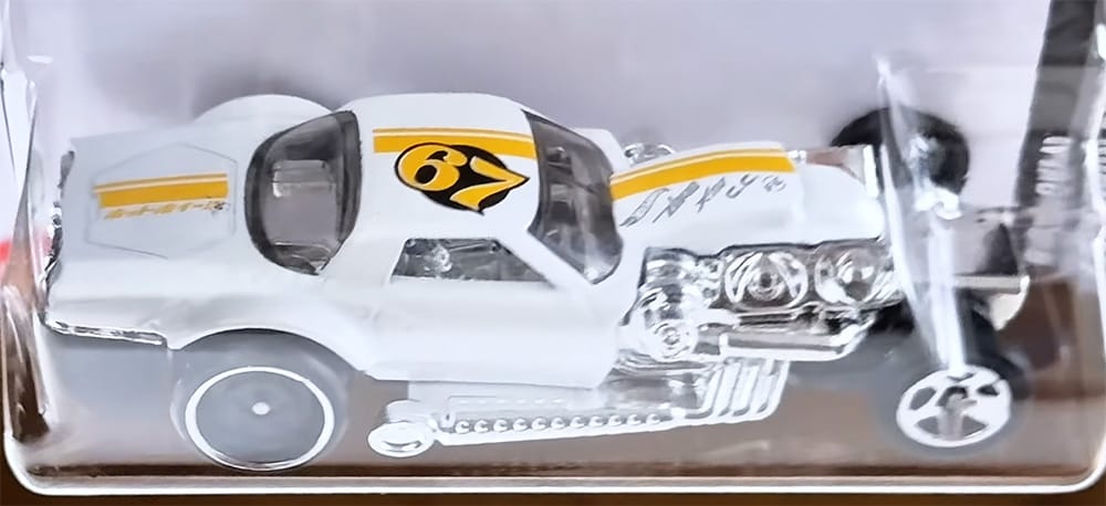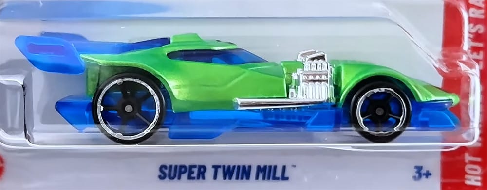 Introduced in 1969, the Twin Mill was Hot Wheels' first-ever fantasy casting. This latest iteration of the twin-engine car is a track-focused version, featuring a front splitter, sleek aerodynamic profile, and a prominent rear wing.