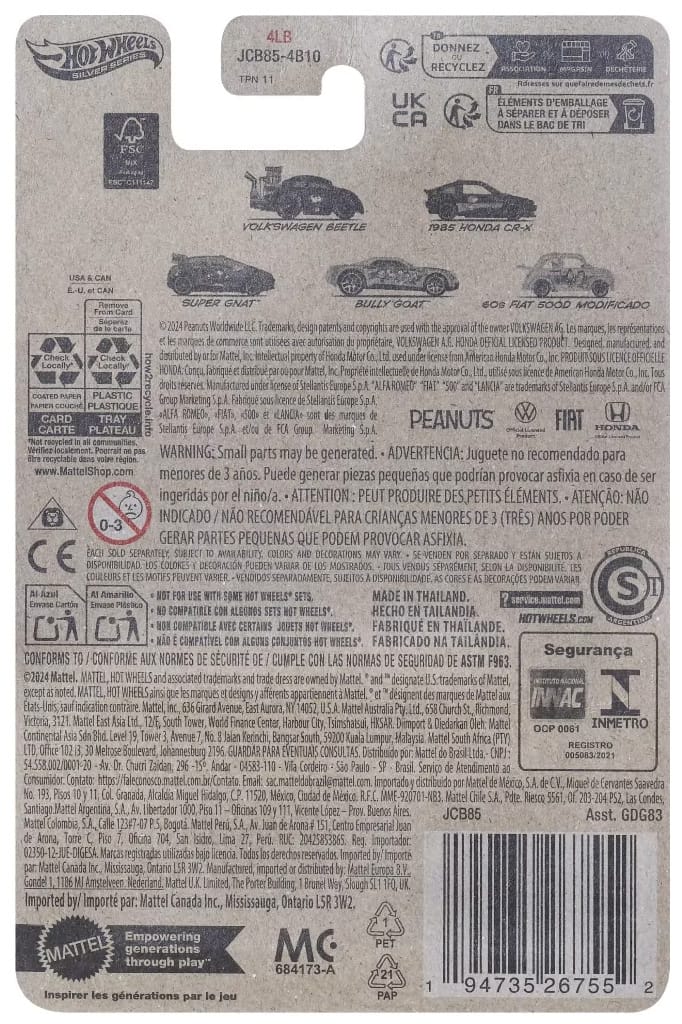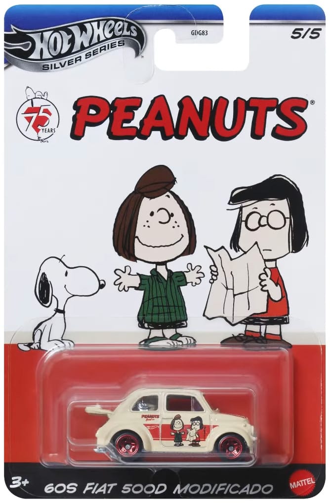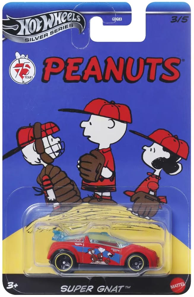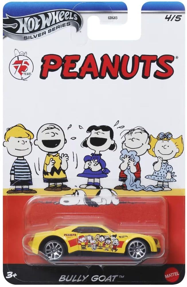 Peanuts is a Silver series, a mid-tier line of Hot Wheels with added detail. It is part of the Themed Entertainment line of Hot Wheels which is assortment GDG83 and ships in 10-count cases.
