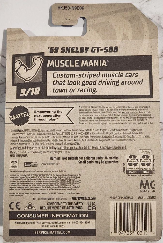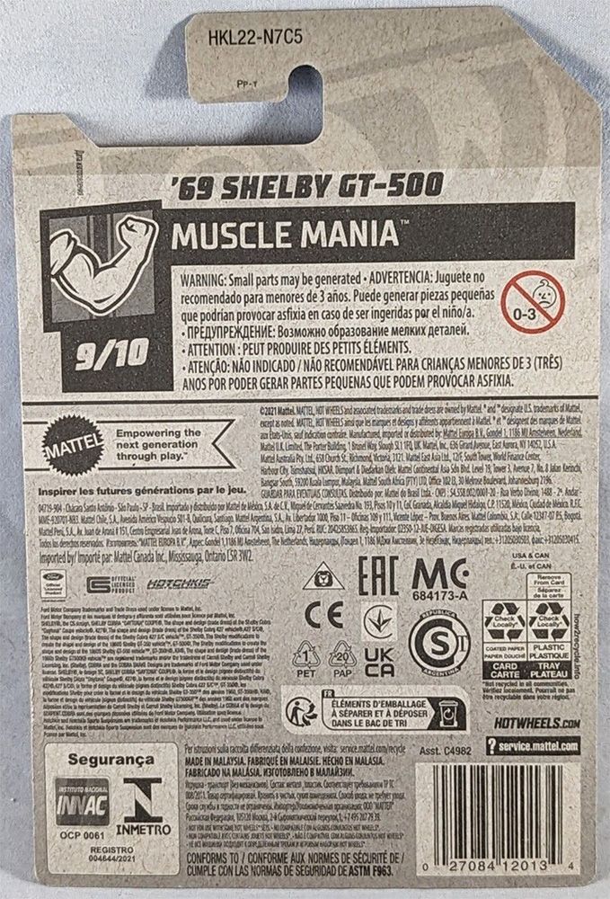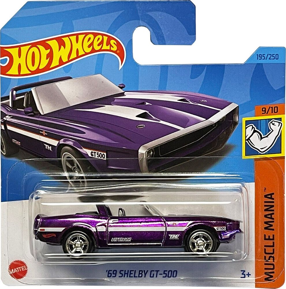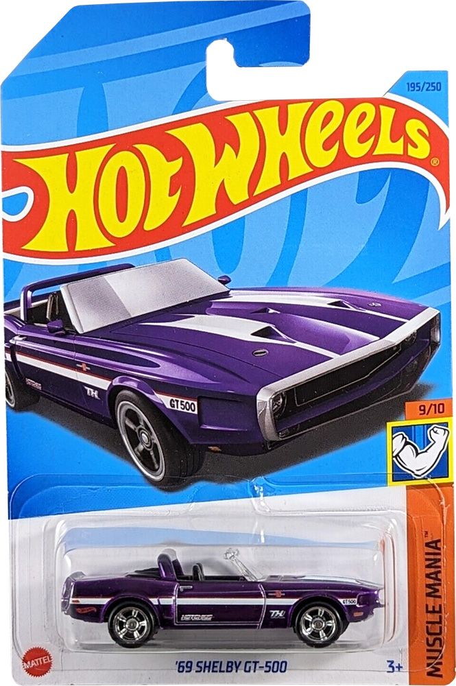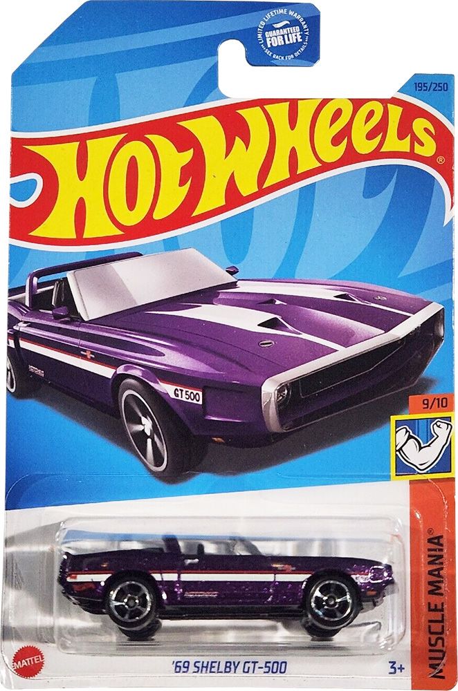 The '69 Shelby GT-500 Super Treasure Hunt packaged on its U.S., international, and short cards. The Spectraflame purple car is 195/250 in the mainline set and 9/10 in the Muscle Mania series.