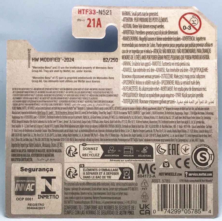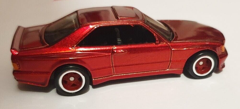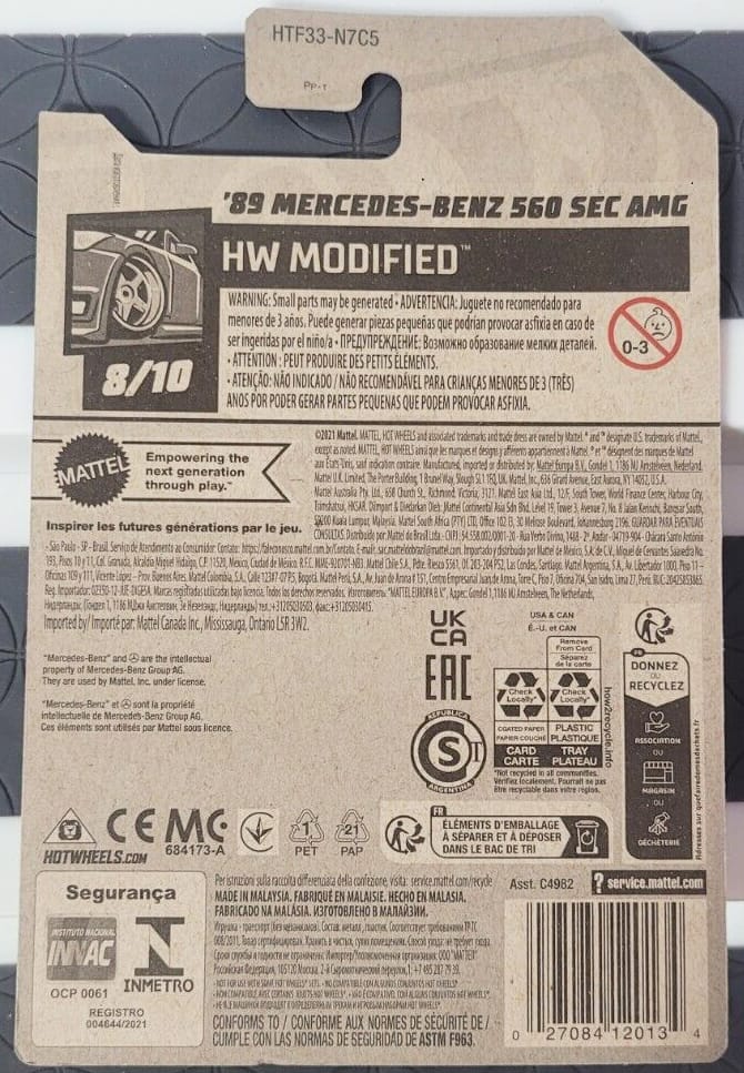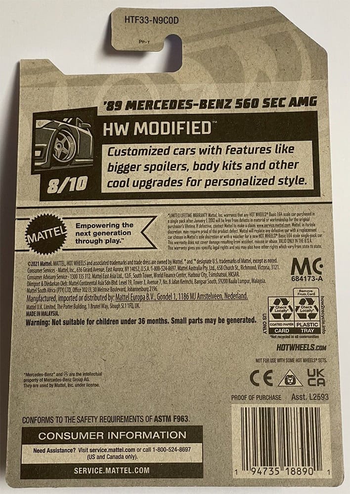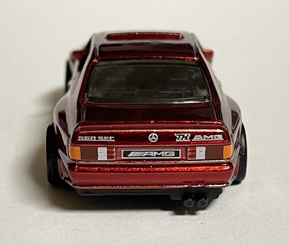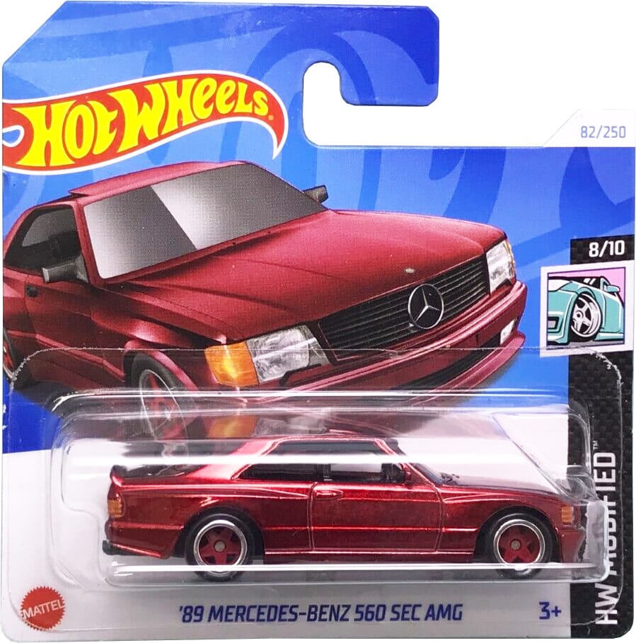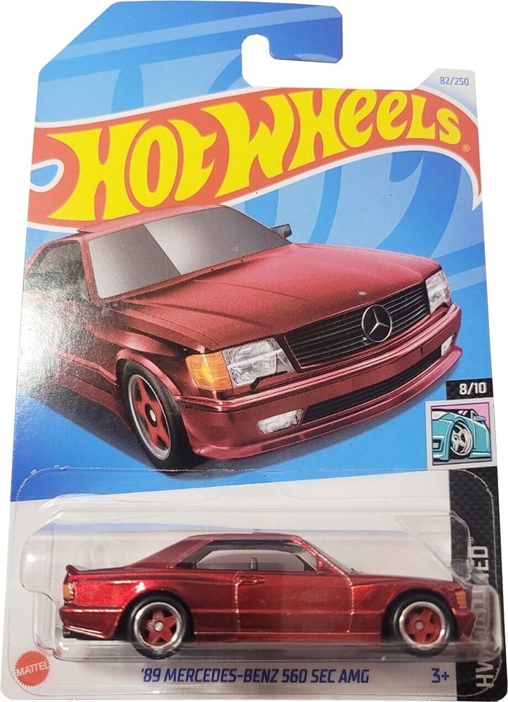The '89 Mercedes-Benz 560 SEC AMG 2024 Super Treasure Hunt packaged on its U.S., international, and short cards.