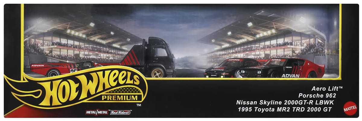 Promo pics of an upcoming Hot Wheels diorama box set. The ADVAN collector set features metal/metal vehicles with premium details and Real Rider wheels.