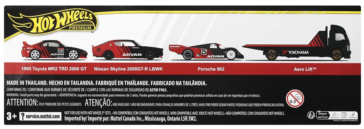 The Porsche, Skyline, and other vehicles in the set are all decorated with ADVAN liveries. ADVAN is a high-performance tire brand from Yokohama, the Japanese tire manufacturer.