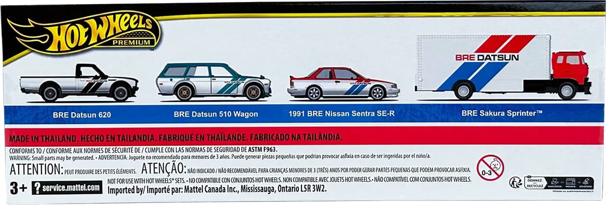 Check out an upcoming Hot Wheels diorama box set featuring vehicles decorated in BRE liveries. Three cars and a transport truck with premium details and Real Rider wheels are on display.