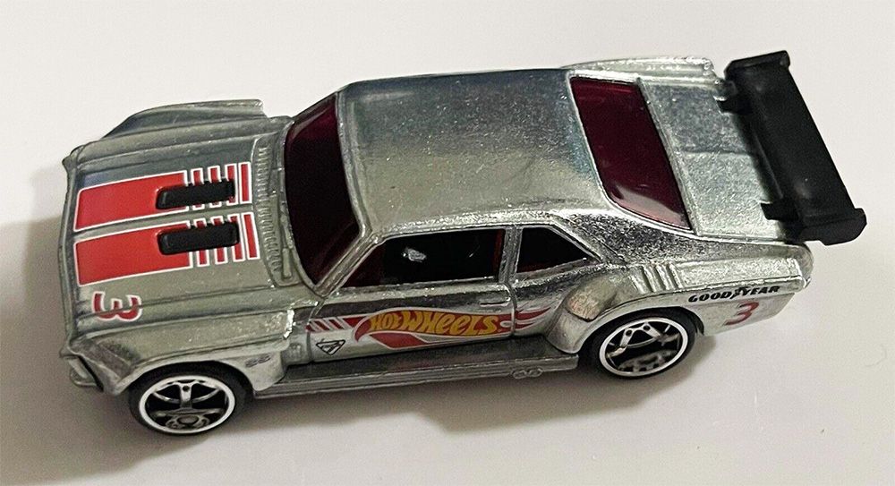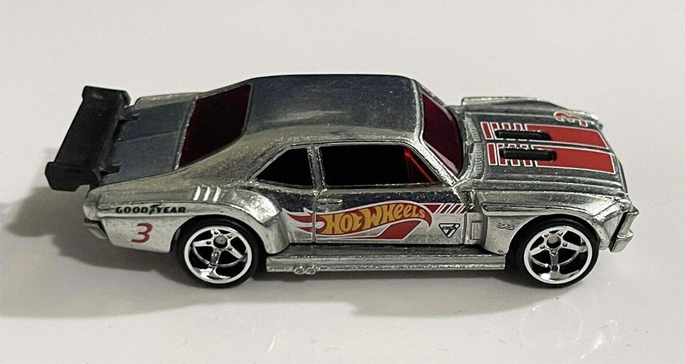 The Hot Wheels casting is based on a 1970 Chevrolet Nova customized with a widebody kit, rear wing, and rollcage.