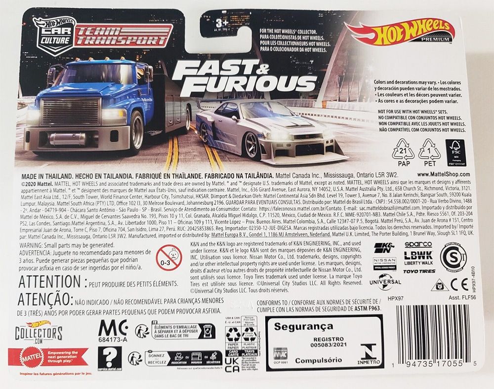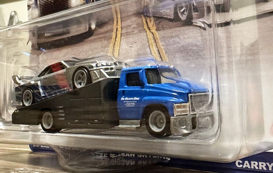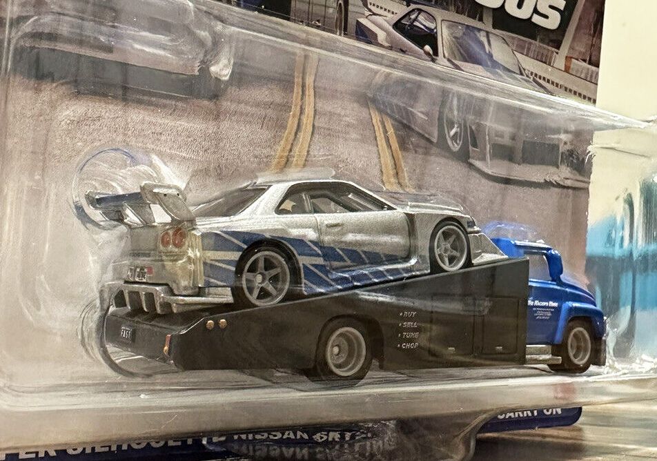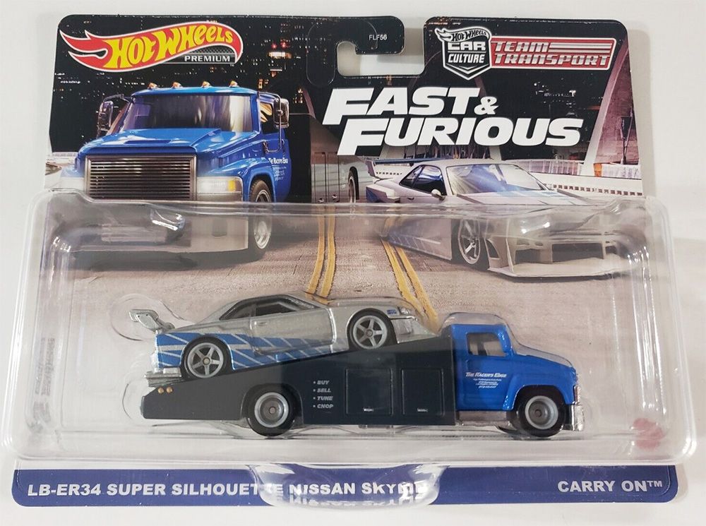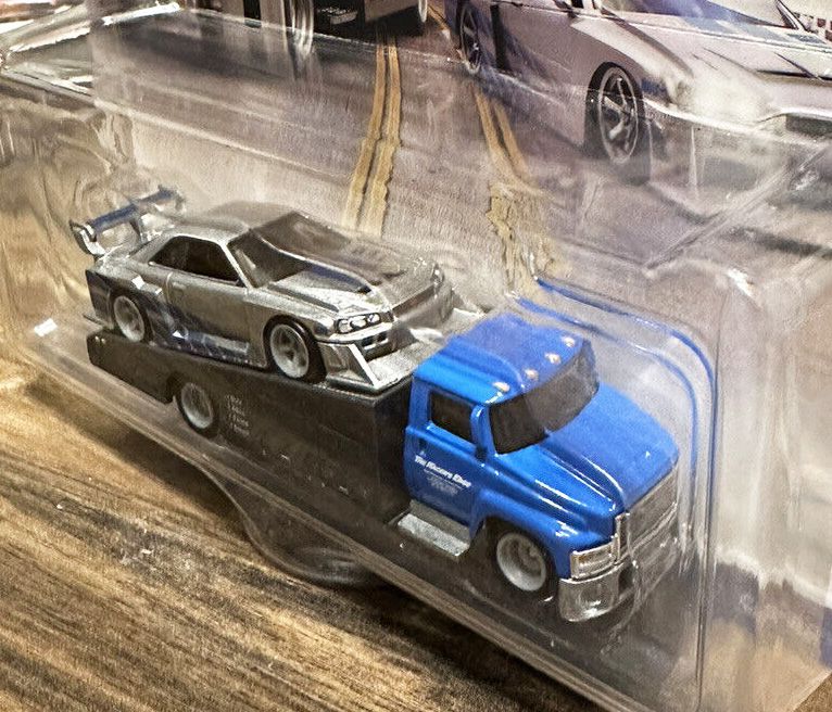 An LB-ER34 Super Silhouette Nissan Skyline and the Carry On transport truck decorated with liveries inspired by the Fast & Furious films are in the 2-pack.
