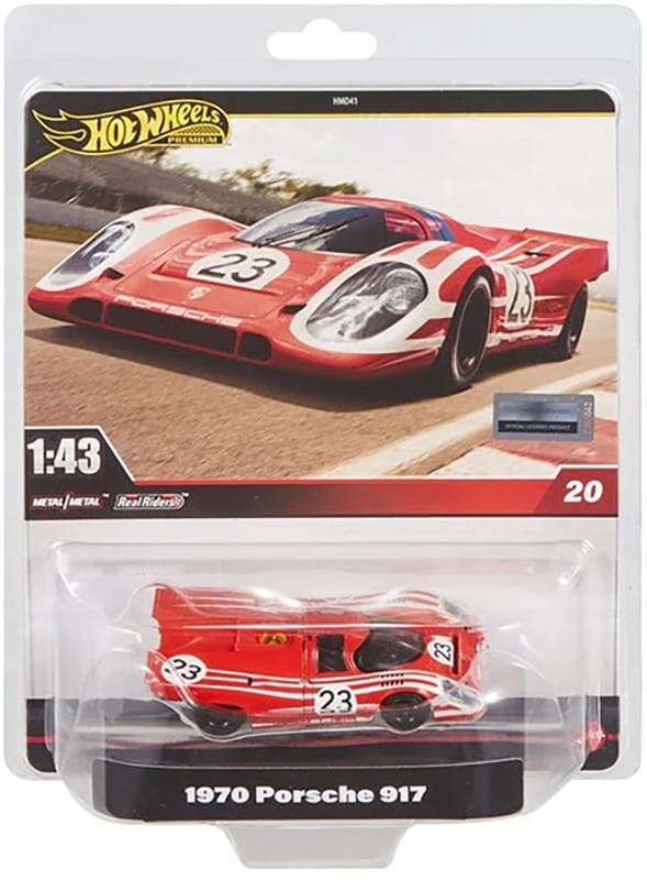 This batch of Hot Wheels 1:43 vehicles are in mix "G" of assortment HMD41 and ship in 6-count cases. A case should include 2 each of the 1970 Porsche 917 and Nissan Z Nismo and 1 each of the others.