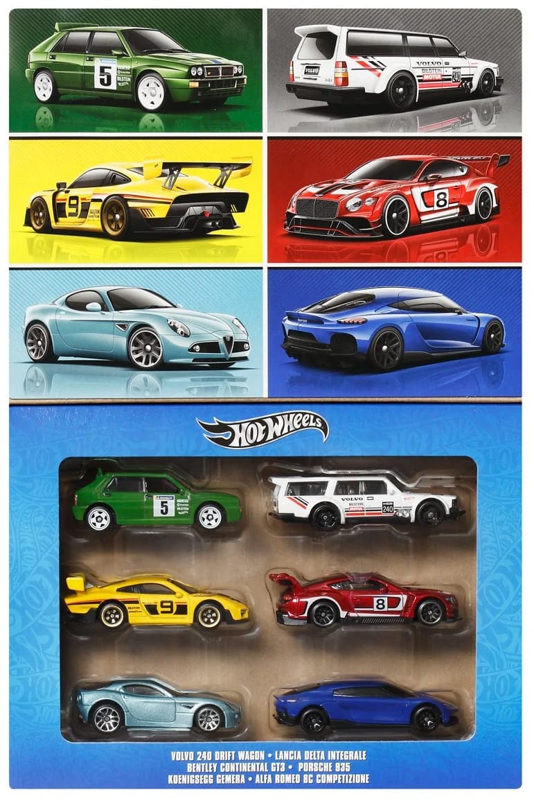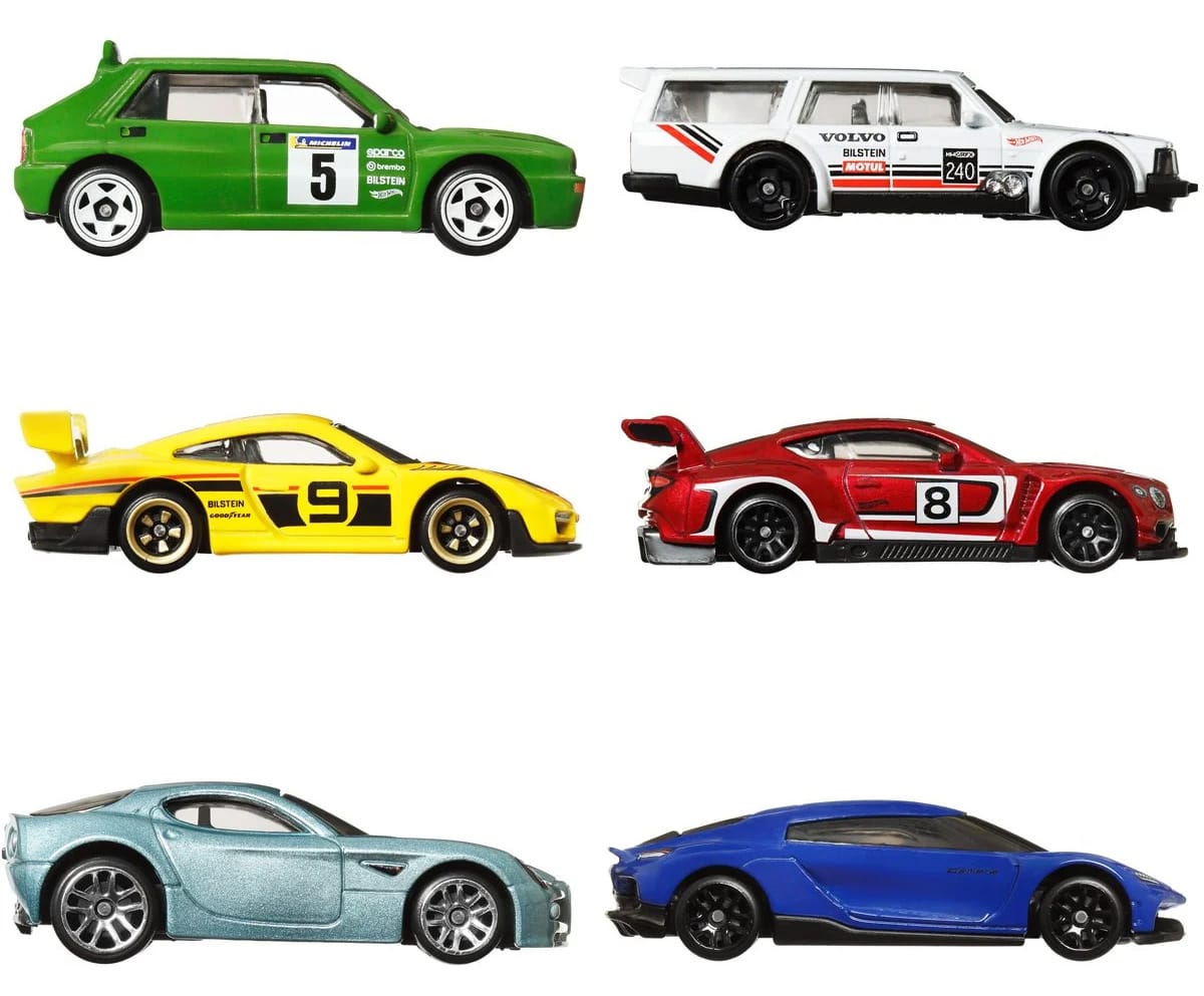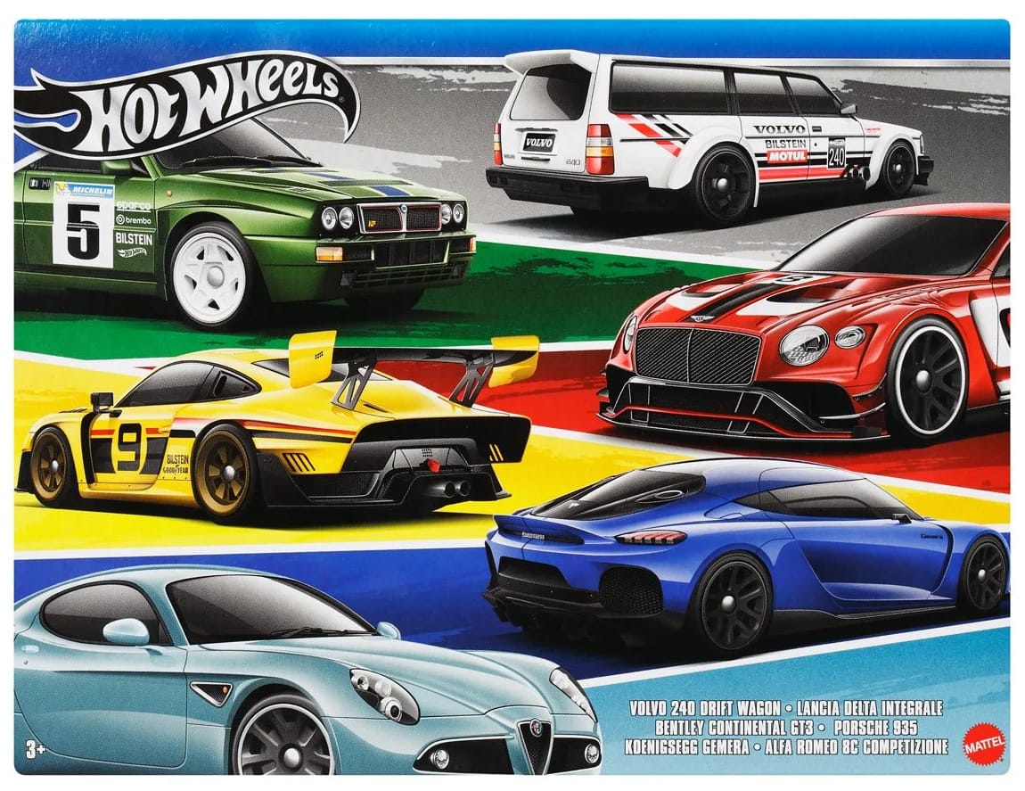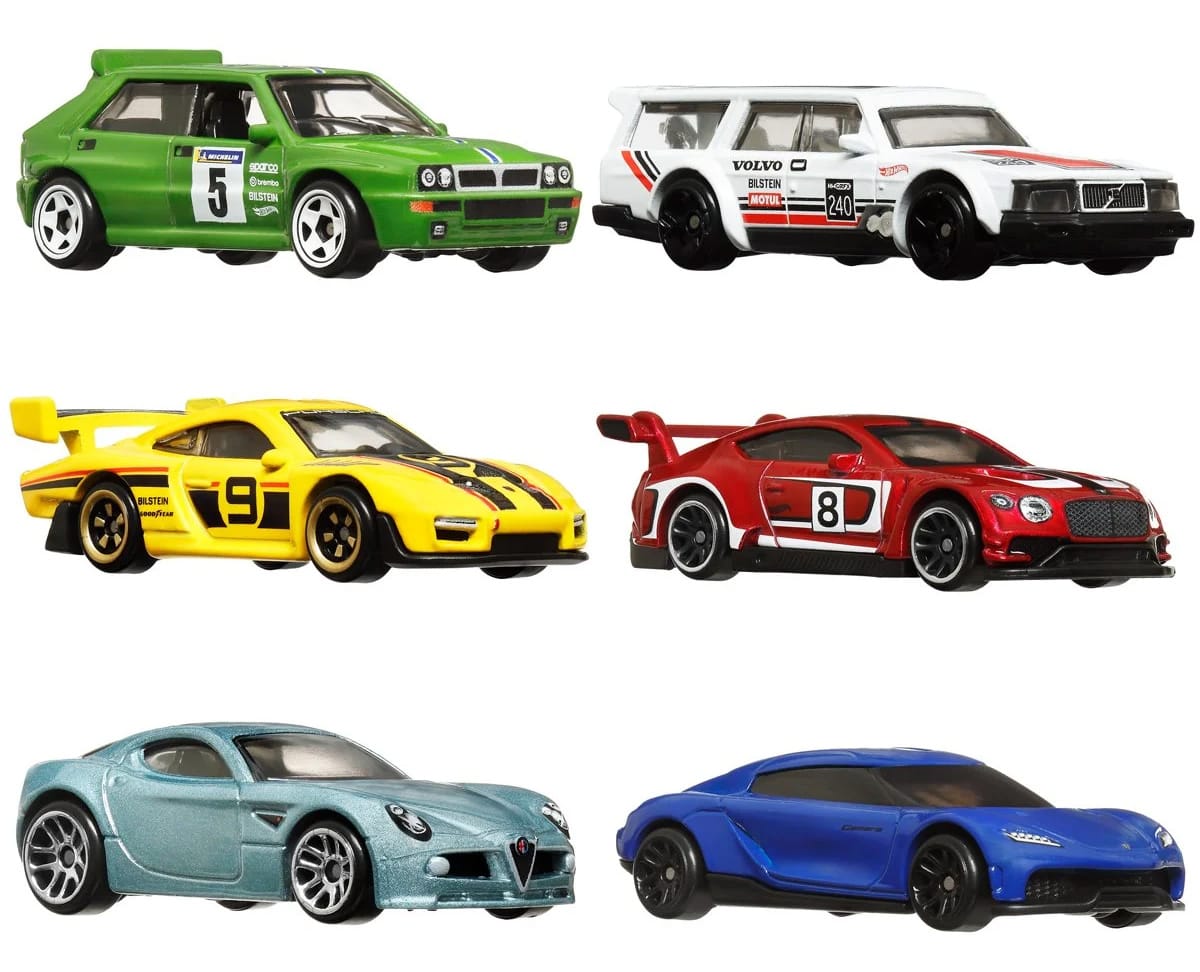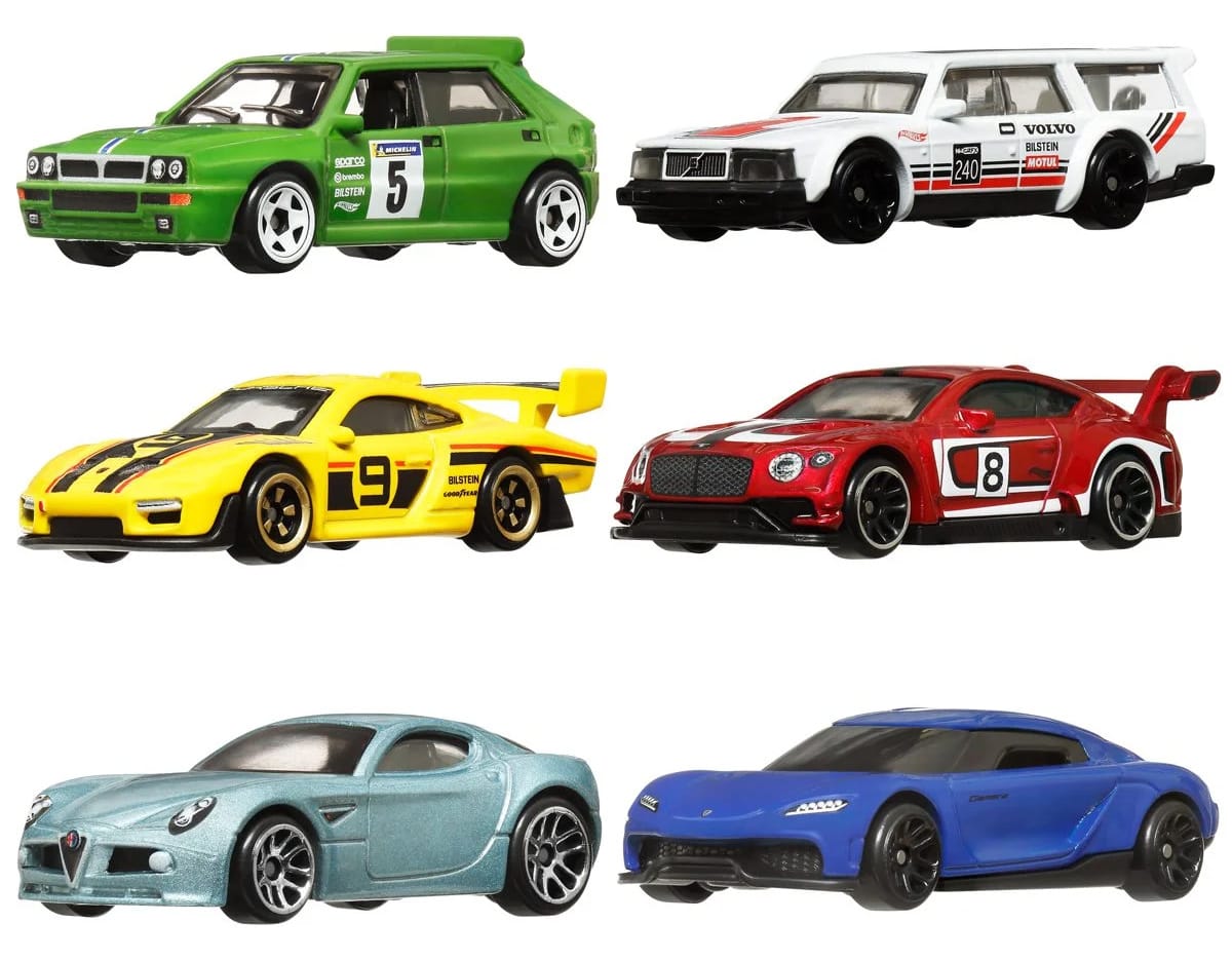 Promo pics of the upcoming Hot Wheels European basic box set for 2024. The set features six cars from British, German, Italian, and Swedish manufacturers.