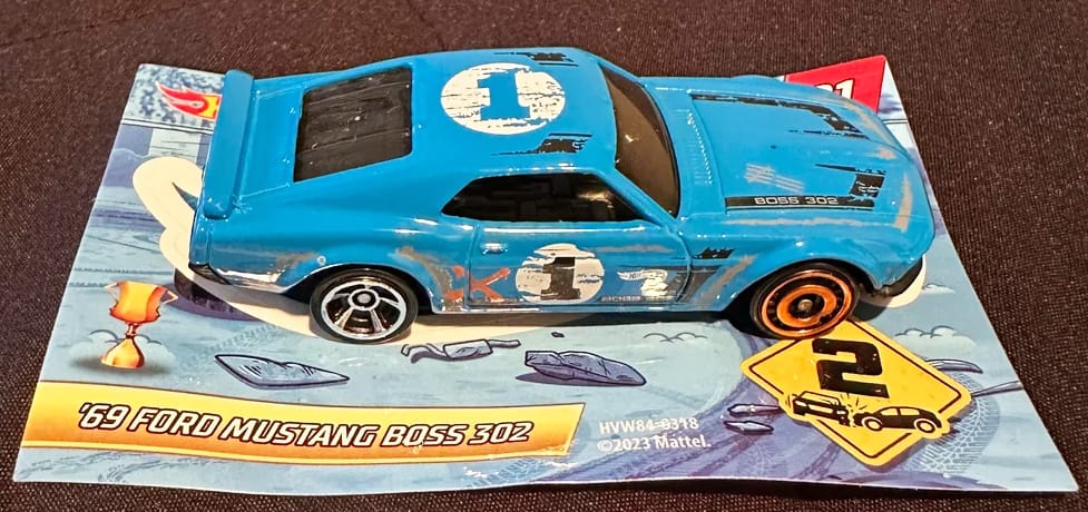 Circled in red is the "/01" code printed on the package of the '69 Ford Mustang Boss 302.