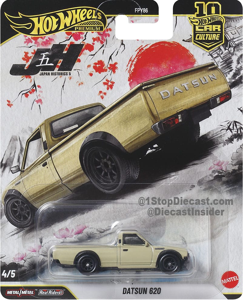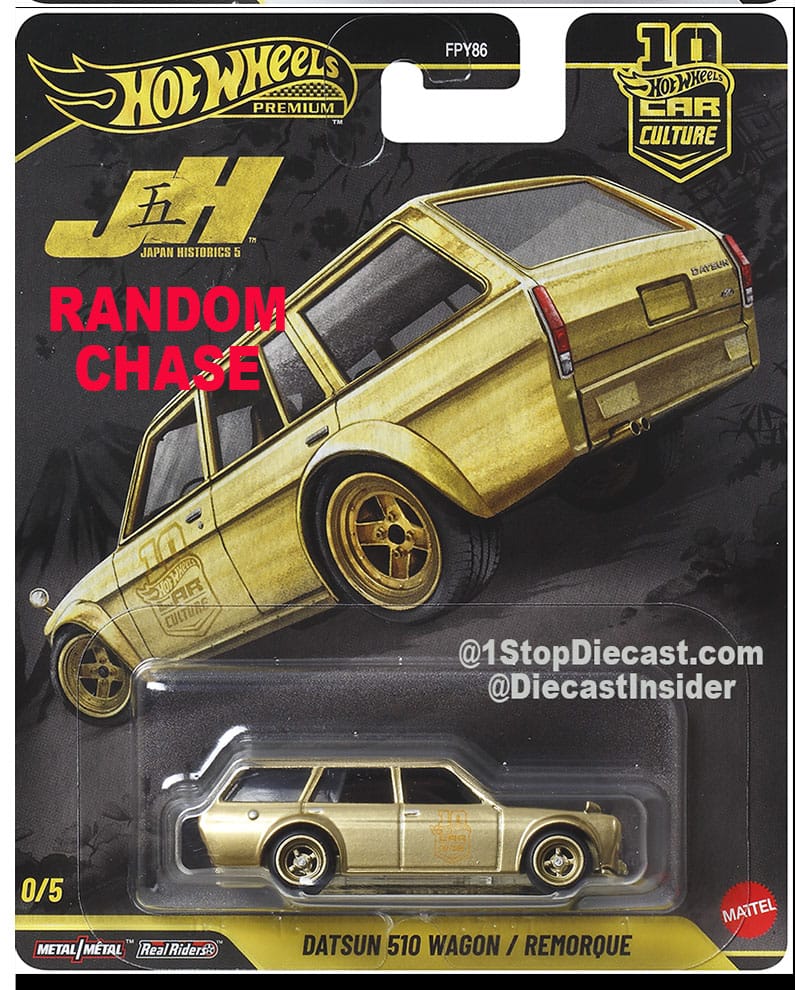 Car Culture vehicles are metal/metal with premium details and Real Rider wheels. Japan Historics 5 is in mix "P" of assortment FPY86 and ships in 10-count cases. Two of each vehicle should be in a case unless one has been replaced with the chase car.