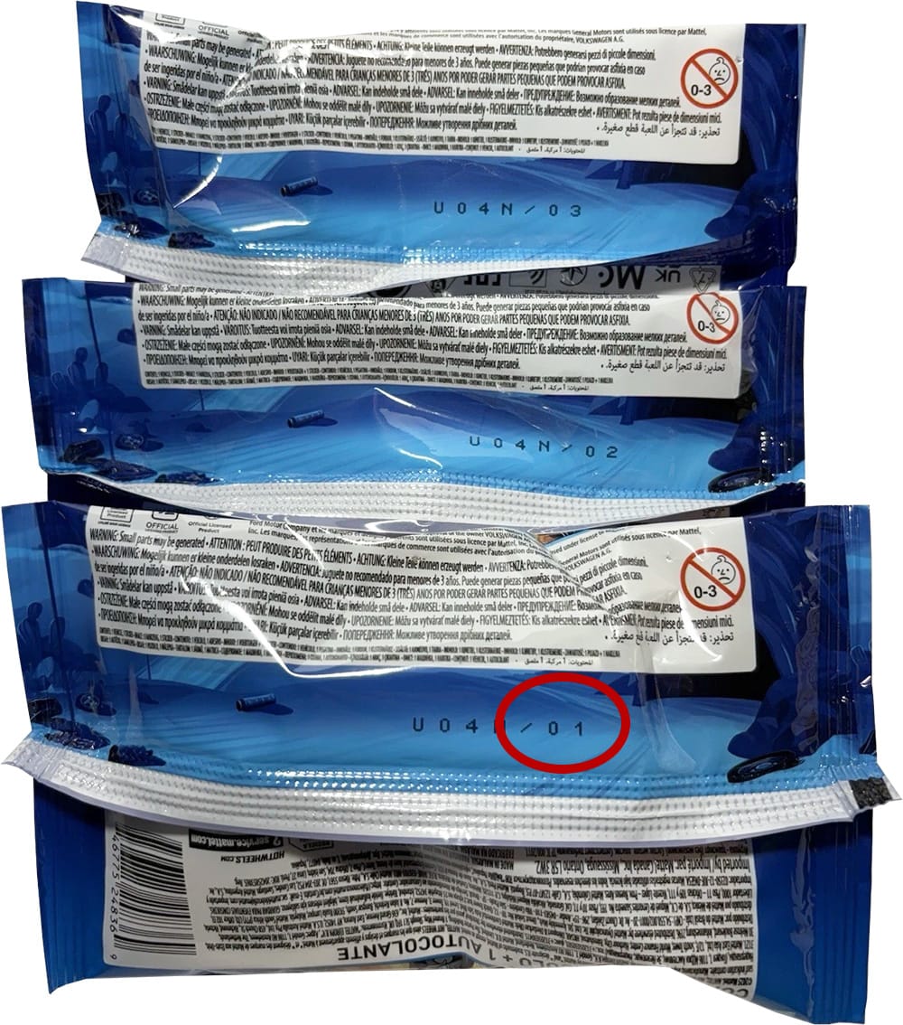The number after the slash reveals which car is inside. In the image above, "/01" is circled in red, which means the pack contains car number 1. A code of "/02" means car number 2, and "/03" means car number 3.