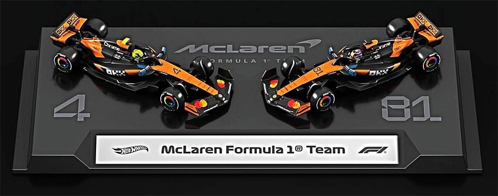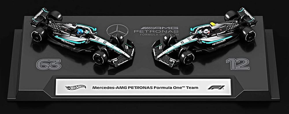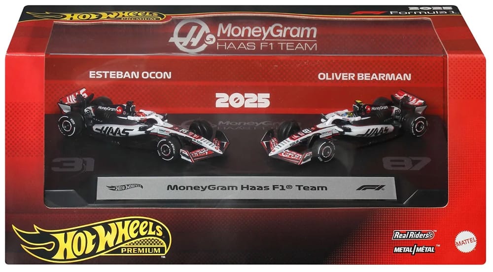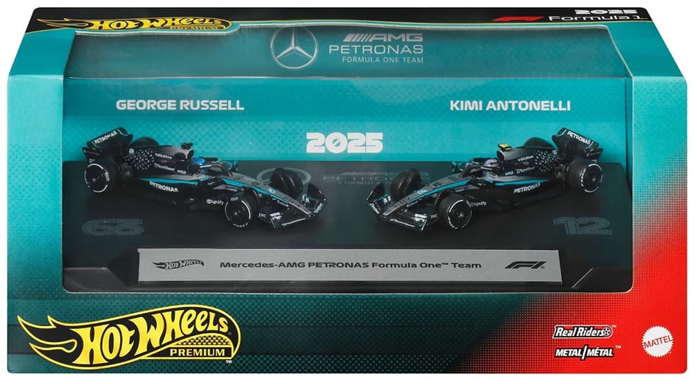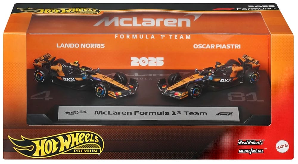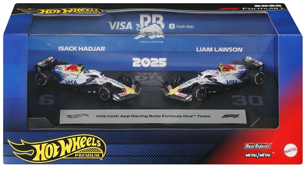 Check out promo pics of the first mix of Hot Wheels Formula One 2-packs for 2026, featuring liveries from the 2025 racing season. Each premium set includes both team cars with Real Riders wheels, displayed on a black base with the team name, and packaged in a window box.