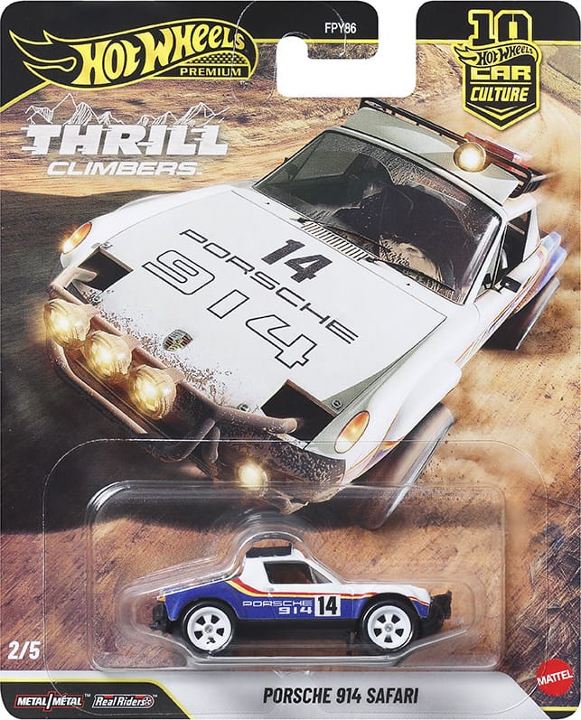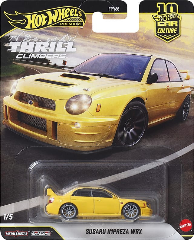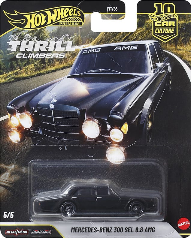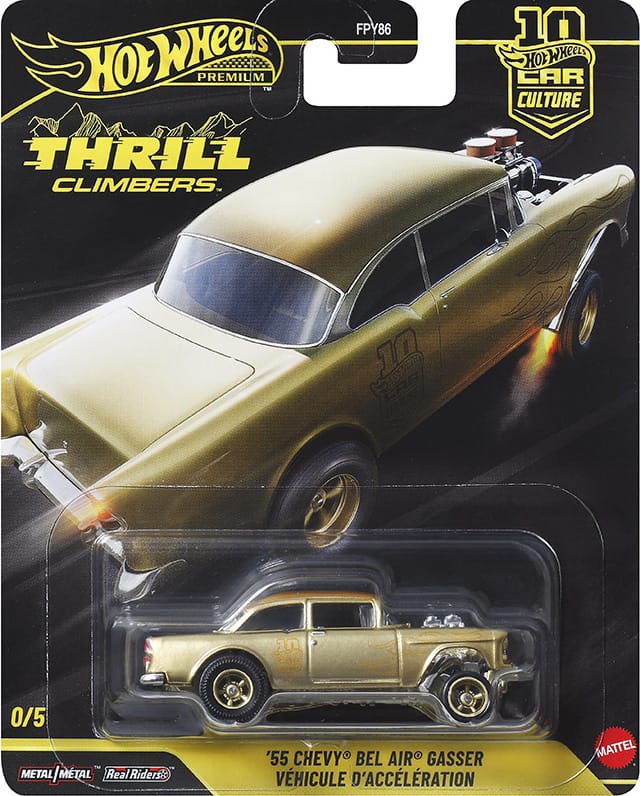 Car Culture vehicles are metal/metal with premium details and Real Rider wheels. Thrill Climbers is in mix "Q" of assortment FPY86 and ships in 10-count cases. Two of each vehicle should be in a case unless one has been replaced with the chase car.