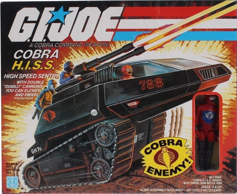 The Cobra H.I.S.S., or High Speed Sentry, is one of the most recognizable vehicles in the G.I. Joe universe. The original toy was released in 1983 and looked like a tracked tank, but it actually rolled on small hidden wheels underneath. It came with a red suited H.I.S.S. Driver, a clear red canopy, rotating cannons, and decals marked with the number 788.