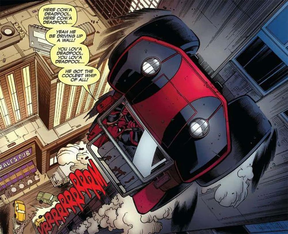The Dead-Buggy first appeared in Spider-Man/Deadpool #2. Deadpool explains that he pulled the original Spider-Buggy from the Hudson River, where it had been since the 1970s. He rebuilt it in his own style with red and black paint, Deadpool graphics, Deadpool hubcaps, and added weapons.