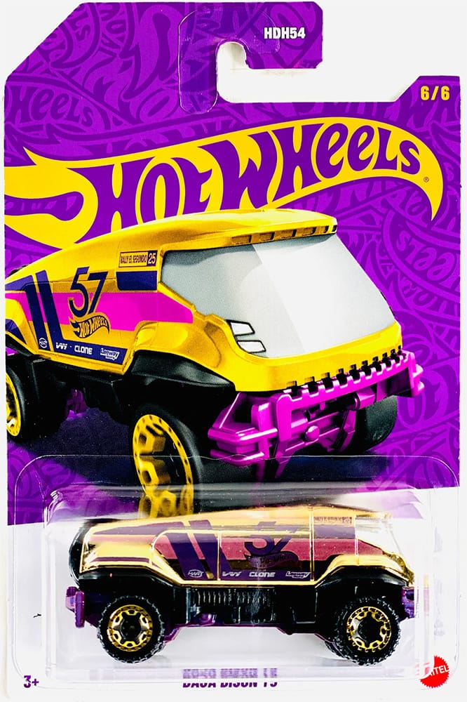 Five of the cars are Metalflake purple with gold chrome accents. The sixth vehicle, the Baja Bison T5, is primarily gold chrome and the chase car of the set. Chase cars are usually one per case.