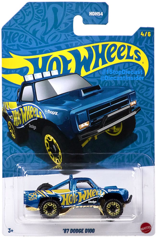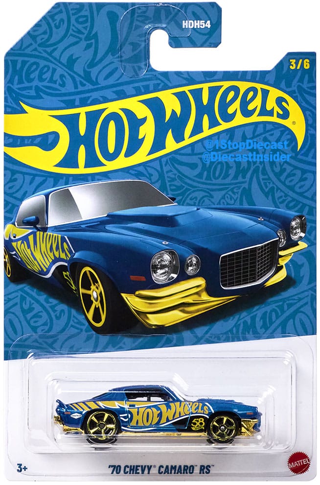 Promo pics of Hot Wheels 58th Anniversary series. Six vehicles are in the set, each with a blue and gold livery with the Hot Wheels logo and an anniversary emblem.