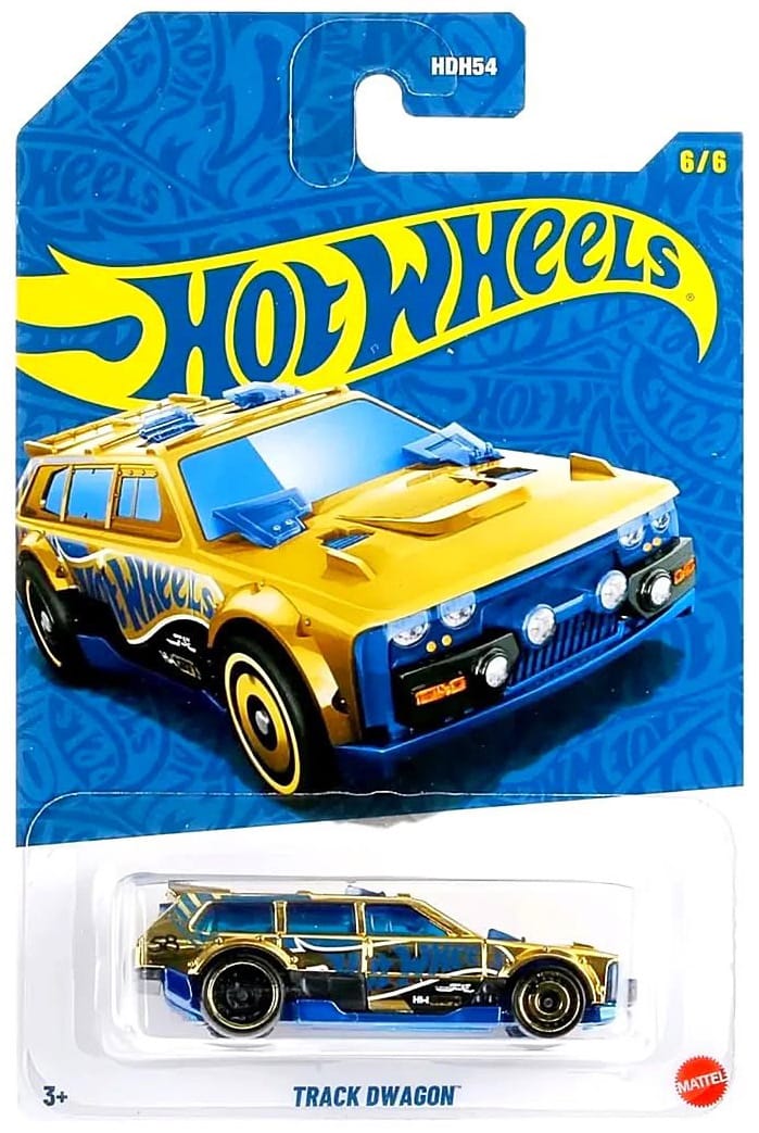 Five cars are Metalflake blue with gold chrome accents. The sixth car, a Track Dwagon, is gold chrome with blue graphics and serves as the chase car of the set, which usually means one per case.