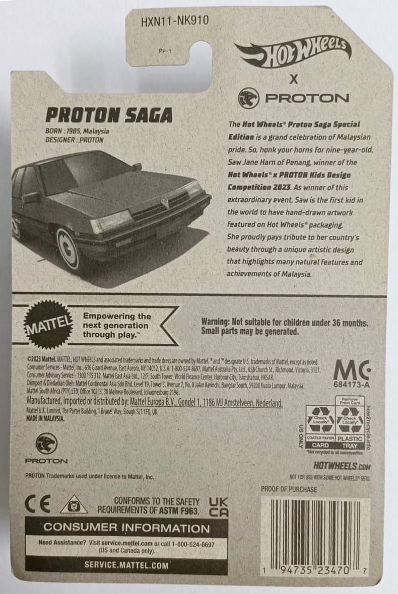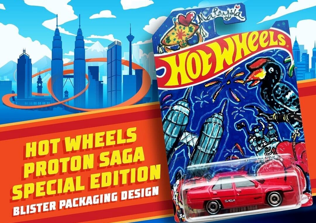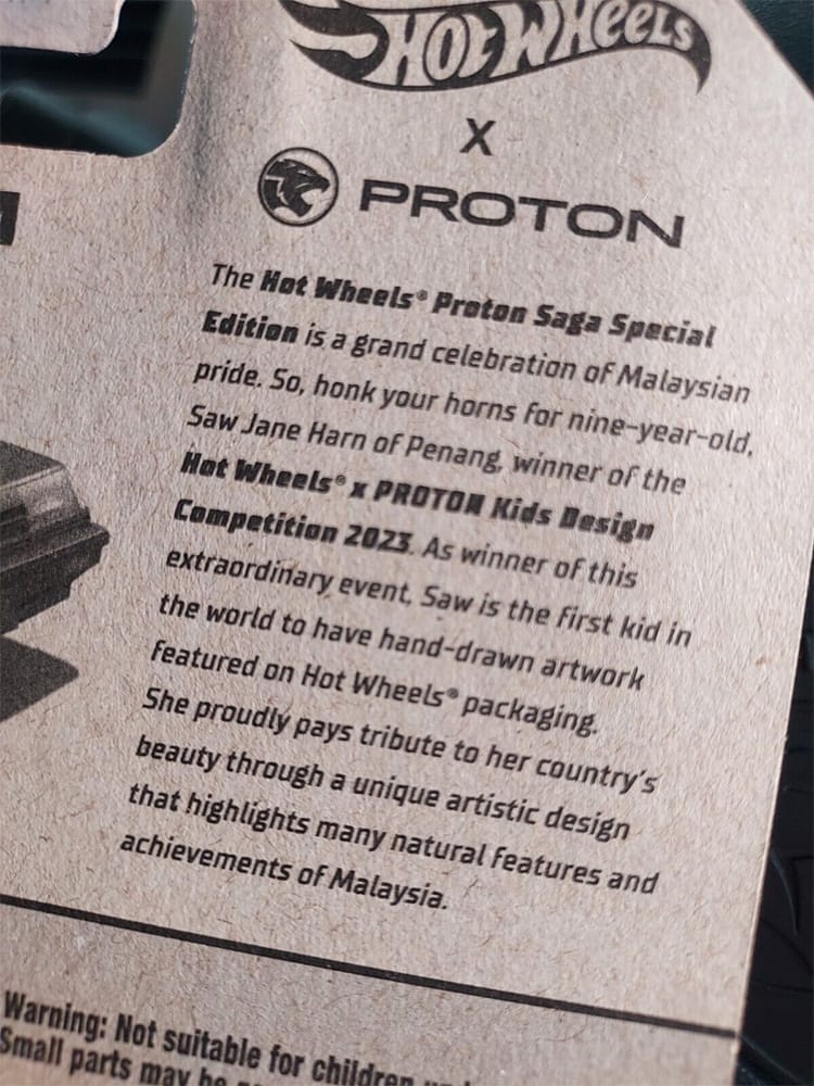 The Special Edition packaging is decorated with hand-drawn artwork created by 9-year-old Saw Jane Harn from Penang, Malaysia. Her design won the Hot Wheels x Proton Kids Design Competition last year.