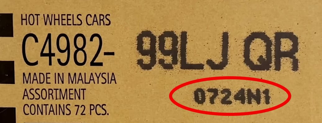Somewhere on the box, you will find another code indicating the date the case was packaged. In the example above, "0724N1" is the date code for the Hot Wheels case.