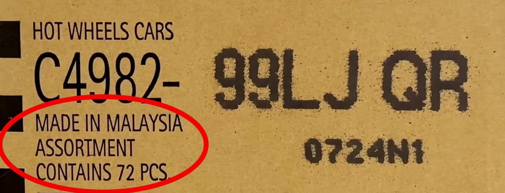 Below the assortment code displays where the Hot Wheels were made and how many are in the case.