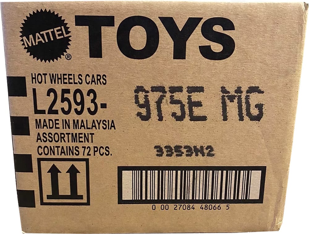 Hot Wheels are organized by assortment and shipped in cases of various sizes. To identify the vehicles inside, codes are printed and stamped on the boxes.