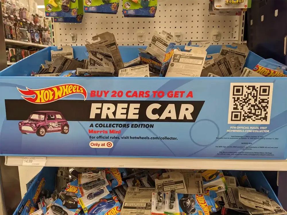 Shelf displays for the Morris Mini have been popping up at Target stores. The display says "Buy 20 Cars" but the promotion actually requires a $20.00 purchase.