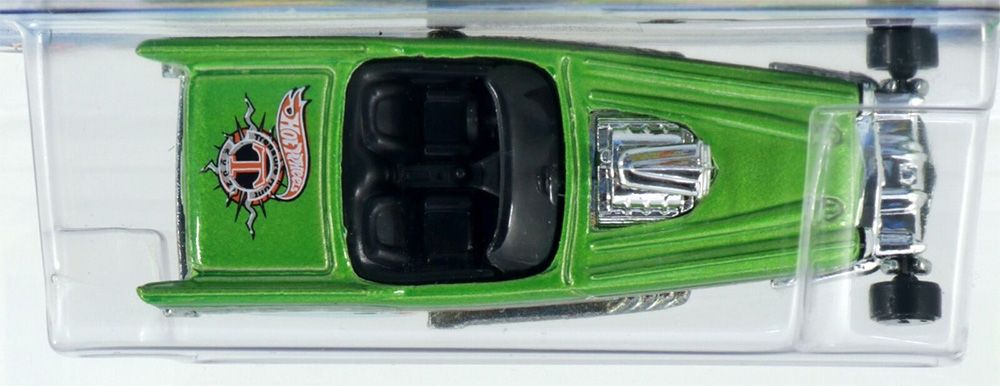 The 2002 Treasure Hunt is Metalflake green with white accents, flames, and a Treasure Hunt emblem on the trunk. It boasts micro wheels in front and Real Rider wheels with white line tires in the back.