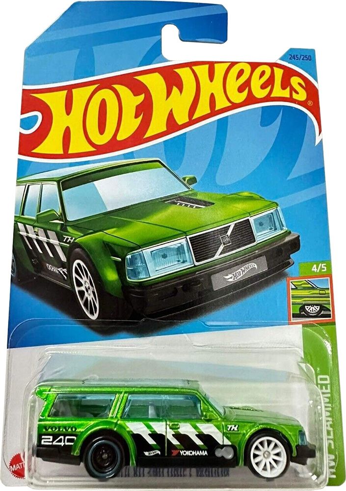 The Volvo 240 Drift Wagon Super Treasure Hunt packaged on its U.S., international, and short cards. The Spectraflame green car is 245/250 in the mainline set and 4/5 in the HW Slammed series.