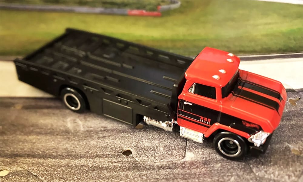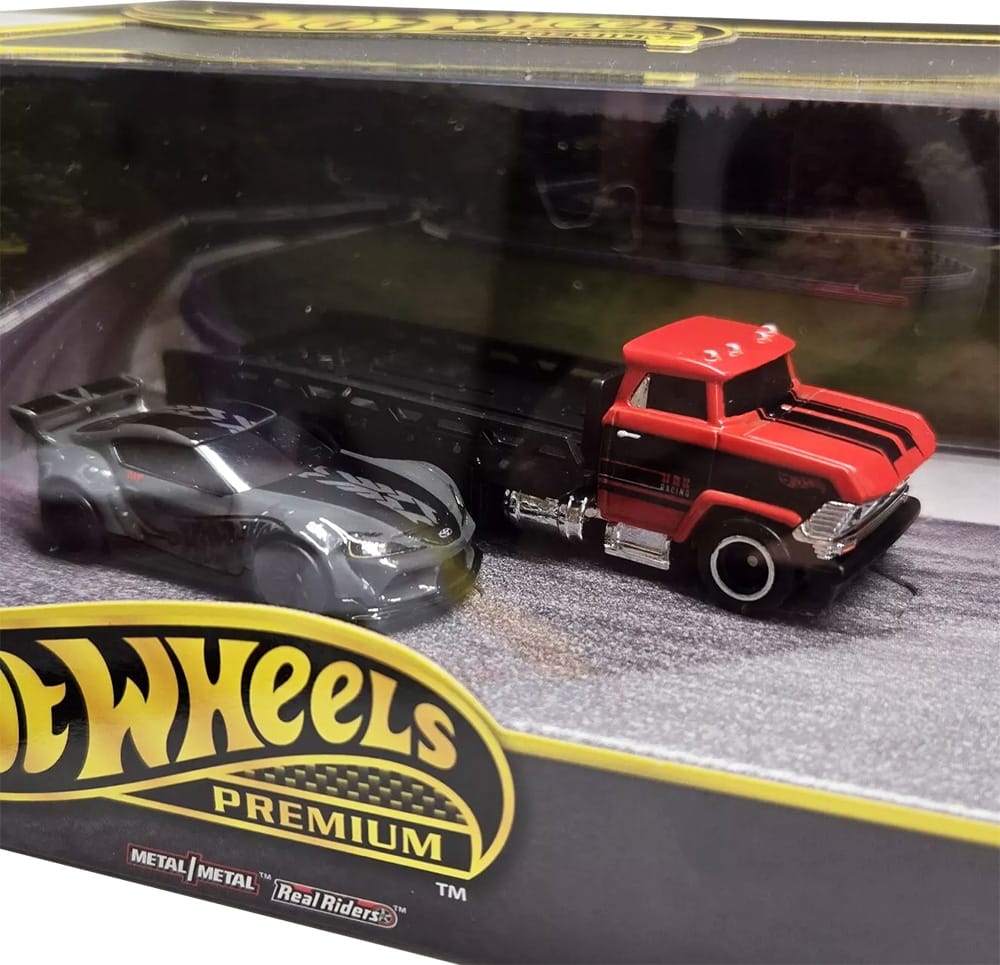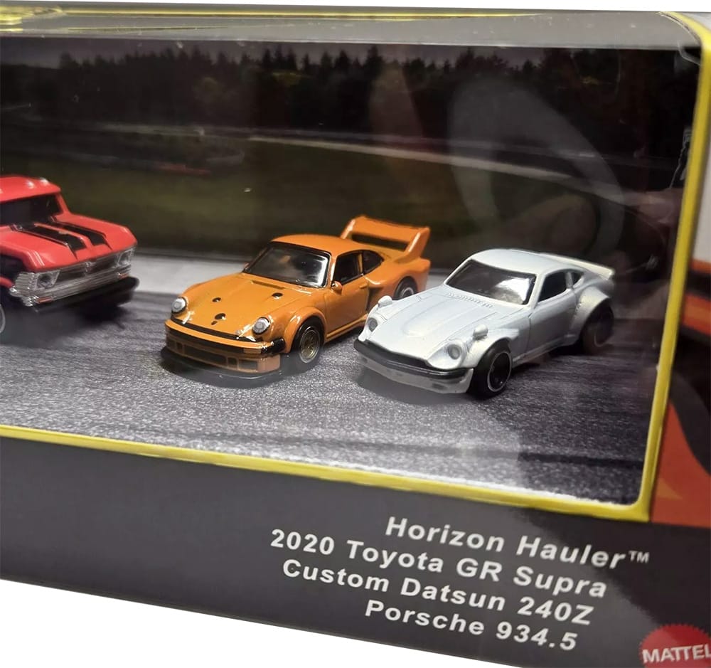 Hitting stores soon is the Track Day Hot Wheels 2025 diorama box set. Three sports cars customized for racing along with the Horizon Hauler transport truck are in the set.