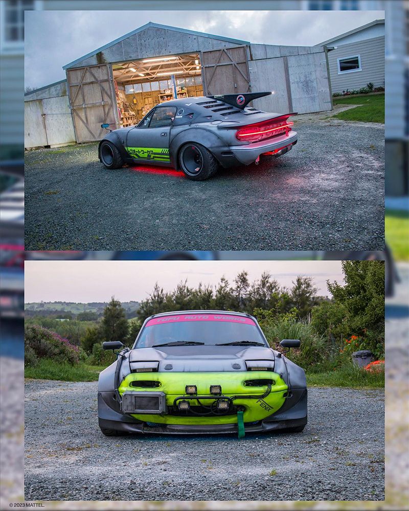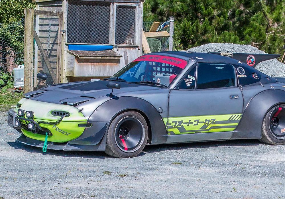 Chris Watson has modified his MX-5 with a weathered airbrushed paint job, rear light bar, custom fin, carbon fiber spoiler, Turbofan wheels, a wide-body kit, and other features.