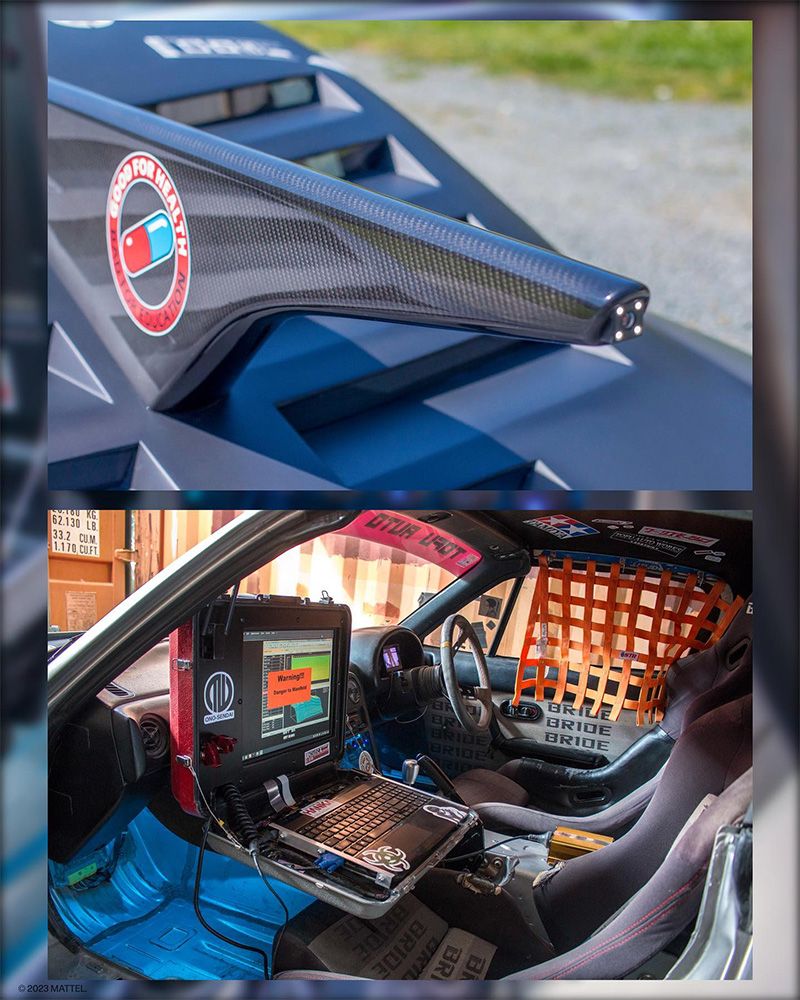 The interior has been updated with racing seats, a three-spoke steering wheel, a digital display, and a laptop mounted in front of the passenger seat.